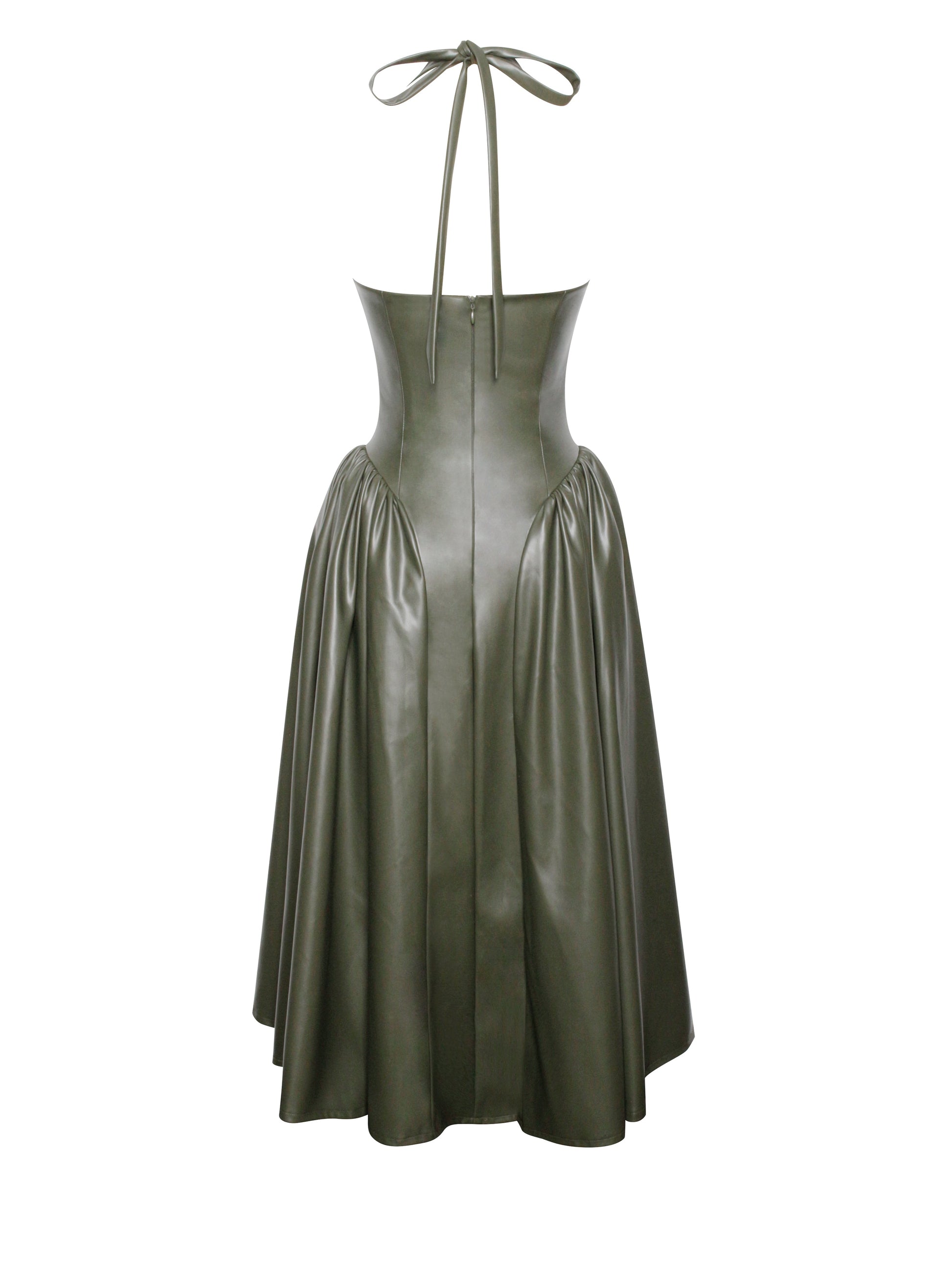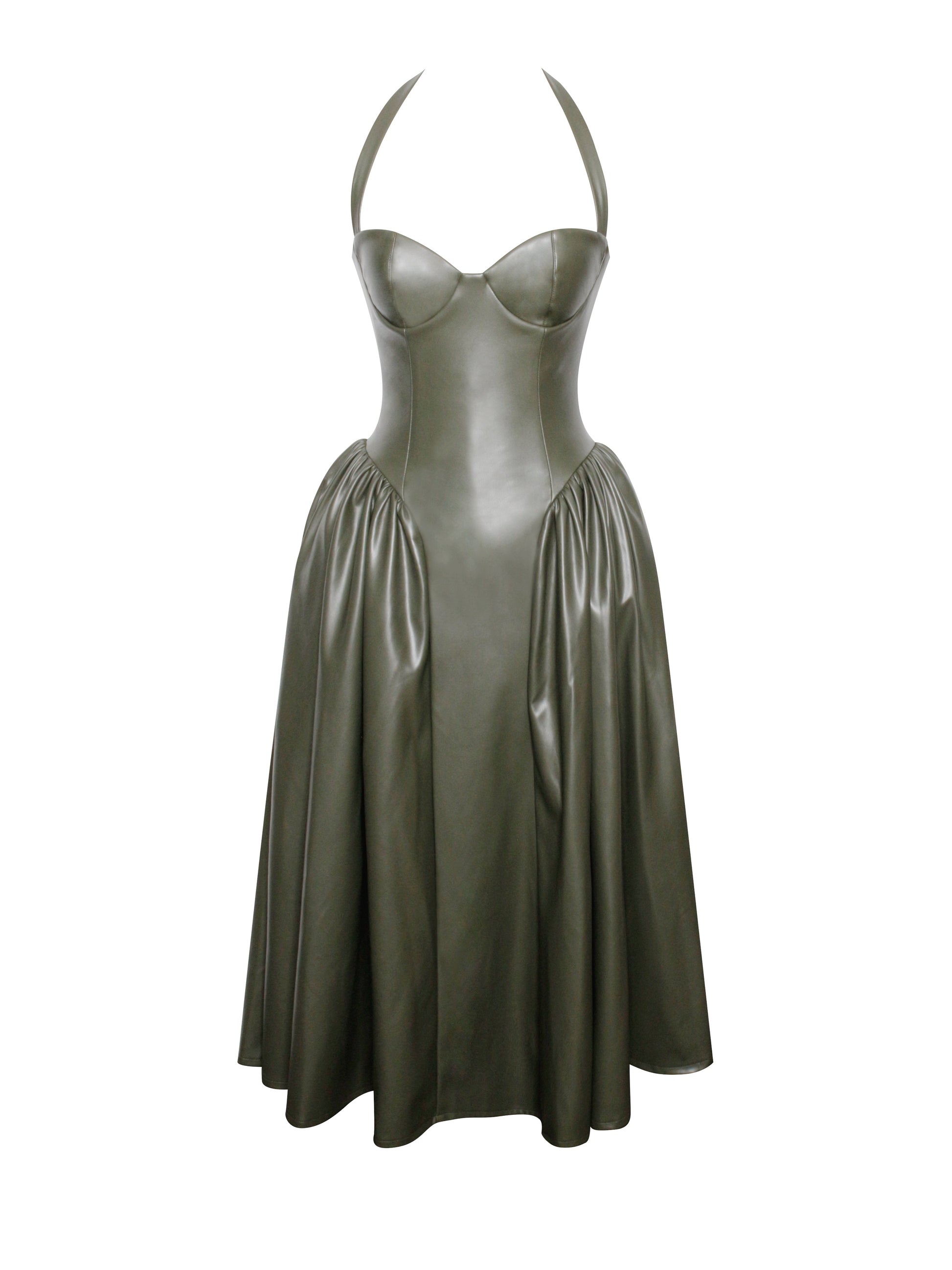 Introducing the Eliana dress, a stunning olive green midi full dress crafted from luxurious vegan leather. This dress features an adjustable halter neckline and padded cups for a perfect fit and added comfort. The built-in corset provides structured support, while the drop waist design enhances your silhouette. Finished with an invisible zipper for a seamless look, this dress effortlessly combines modern style with timeless elegance, making it a standout piece in any wardrobe.
