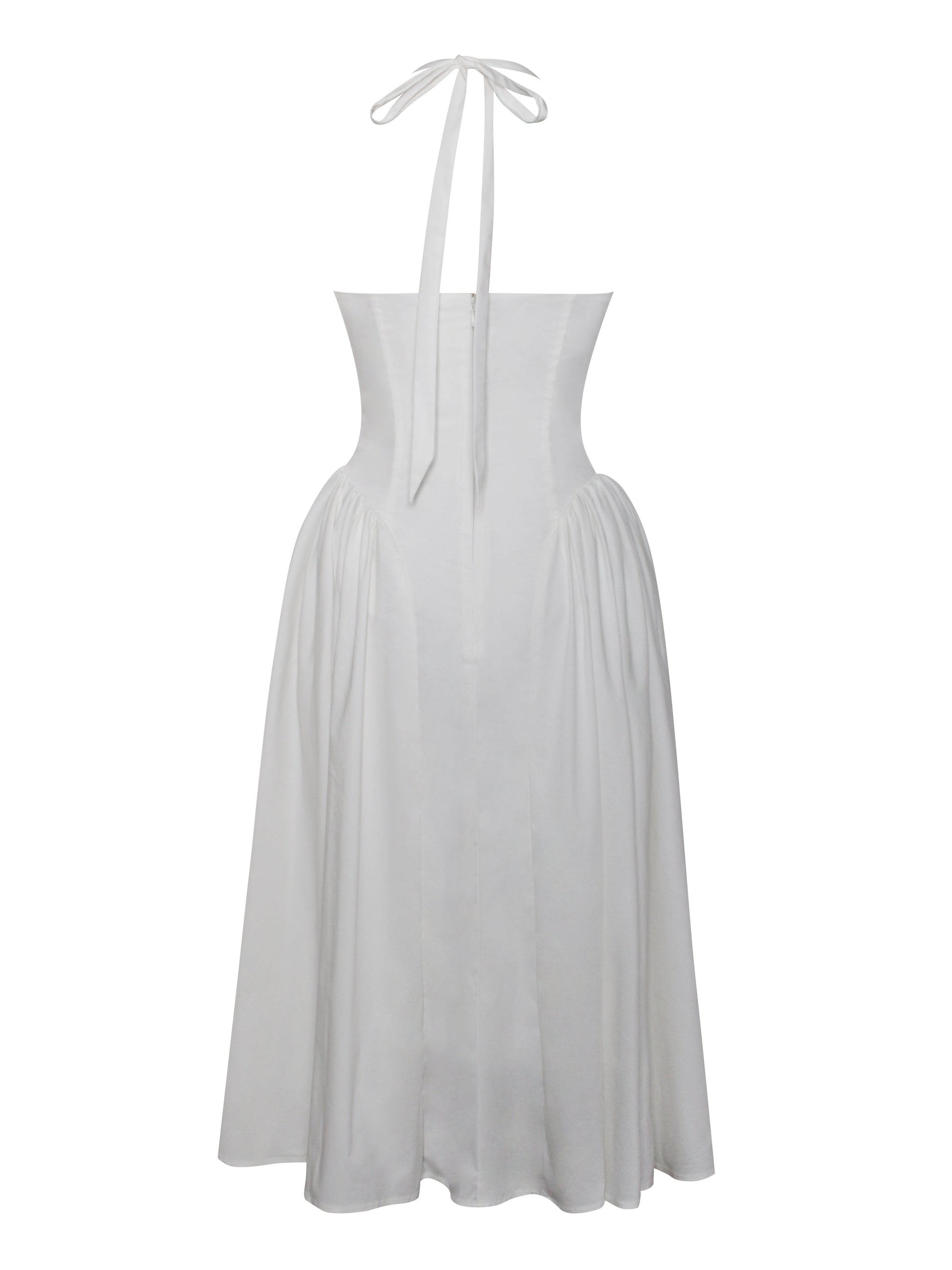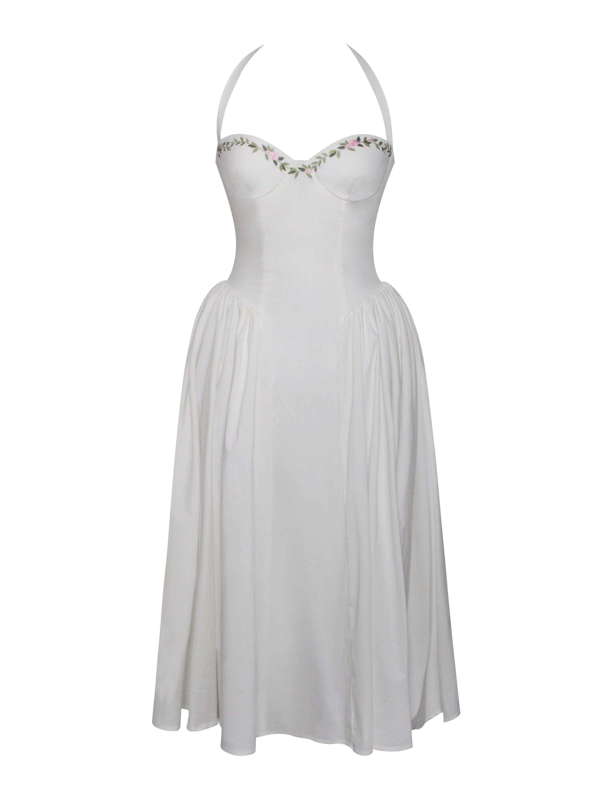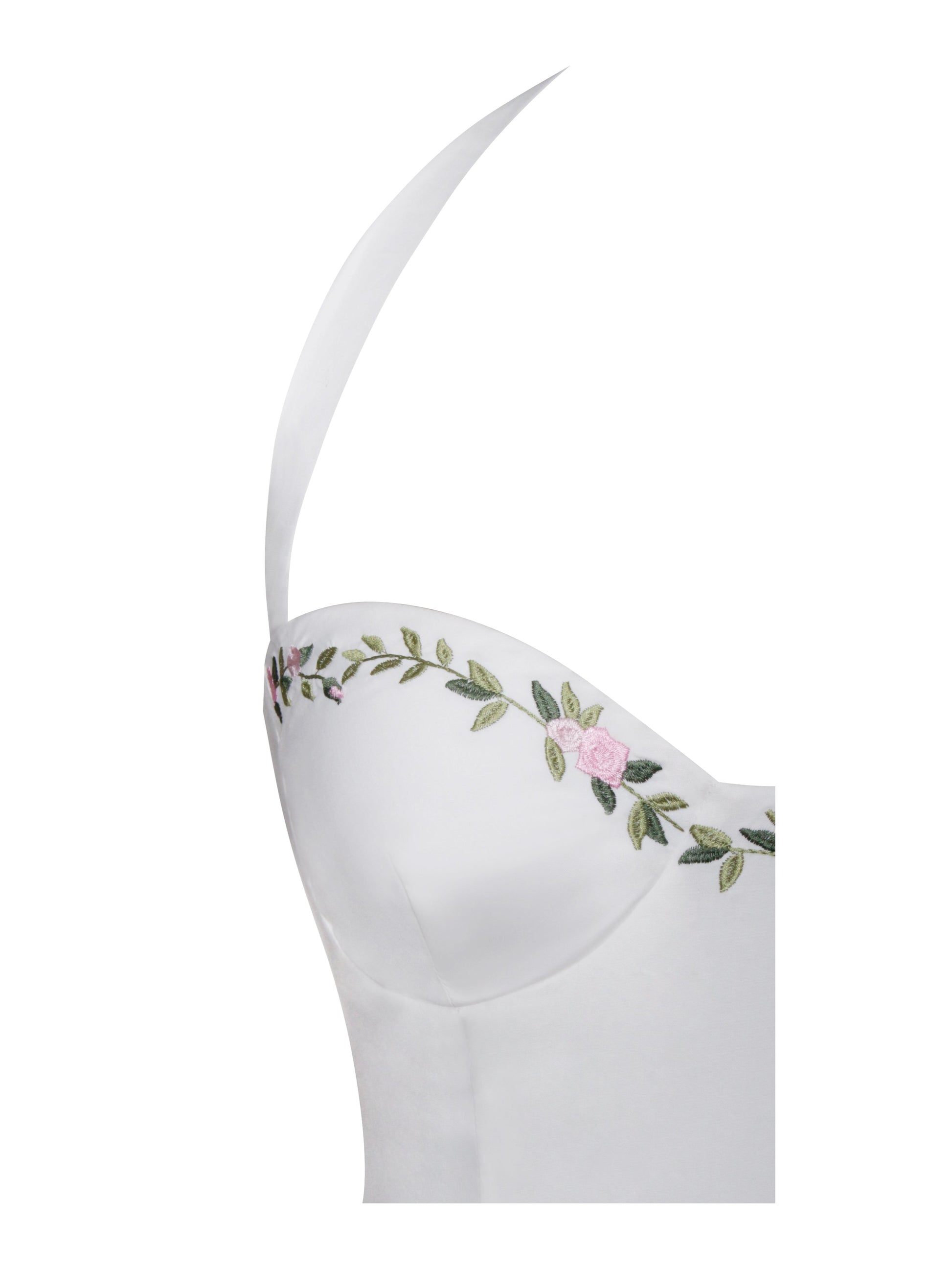 Discover the elegance of our eco-luxe Gianna maxi dress, designed to make a lasting impression with its refined details. Featuring padded cups and built-in boning, this dress offers a flattering and supportive fit. The halter strap exudes sophistication, complemented by delicate embroidered floral details. A pleated skirt flows gracefully to the floor, enhancing its elegant silhouette. An invisible zipper ensures a seamless finish. Ideal for any formal occasion, this dress is also available in a mini version.