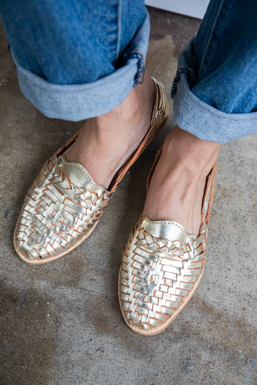 Our best selling, classic leather huaraches done in bright and bold metallic gold. Functional, comfortable, chic and beautiful. Hand crafted by artisans in Mexico, these slip on shoes are a classic staple that only wear better with time.