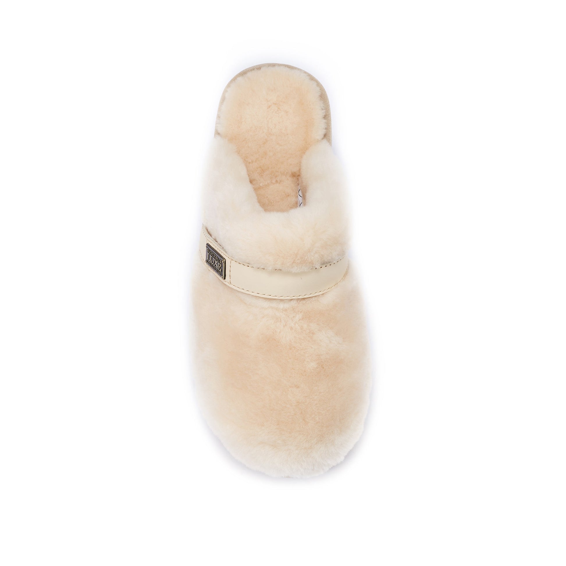 Slip on mule slipper with low sole. Double faced sheepskin with Luxe faux fur outer and leather vamp band detail.