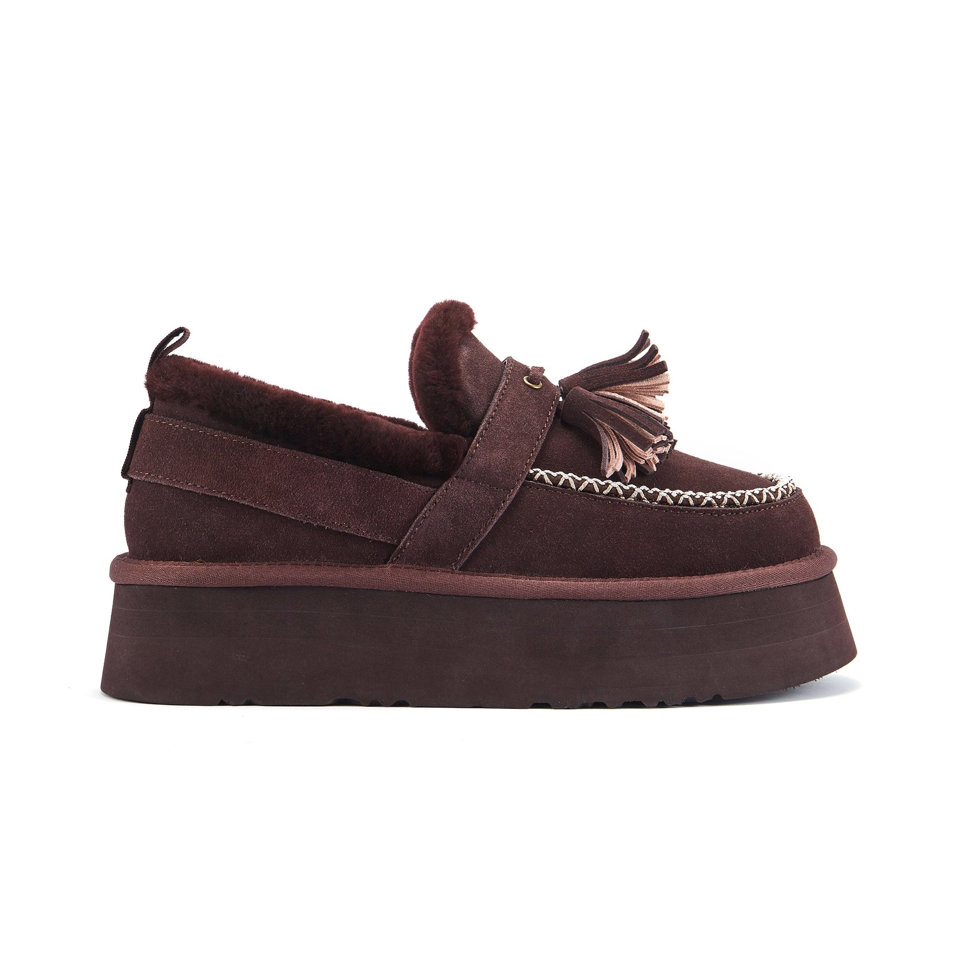 Loafer style shoe on a platform sole with suede tassels and contrast overstitching. Double face sheepskin with soft shearling trims. Suede upper.